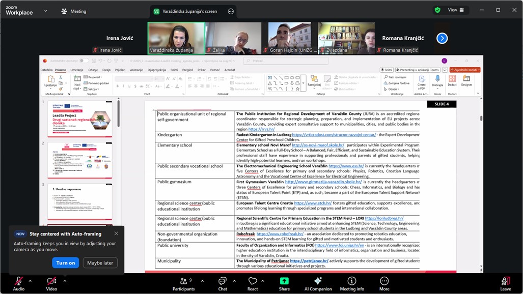 Županija je u prosincu organizirala drugi sastanak regionalnih dionika na kojem su sudjelovali stručnjaci iz područja obrazovanja iz Dječjeg vrtića Radost Ludbreg, Europskog talent centra Hrvatska, Regionalnog znanstvenog centra LORI Ludbreg, Udruge Robofreak, Fakulteta organizacije i informatike, Općine Petrijanec, Osnovne škole Novi Marof, Elektrostrojarske škole Varaždin, Prve gimnazije Varaždin te Javne ustanove za regionalni razvoj Varaždinske županije (JURA).